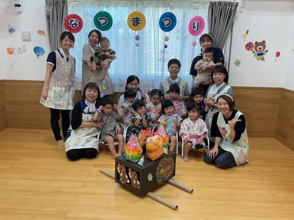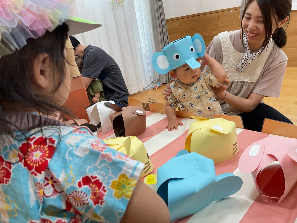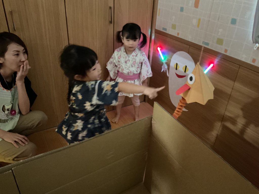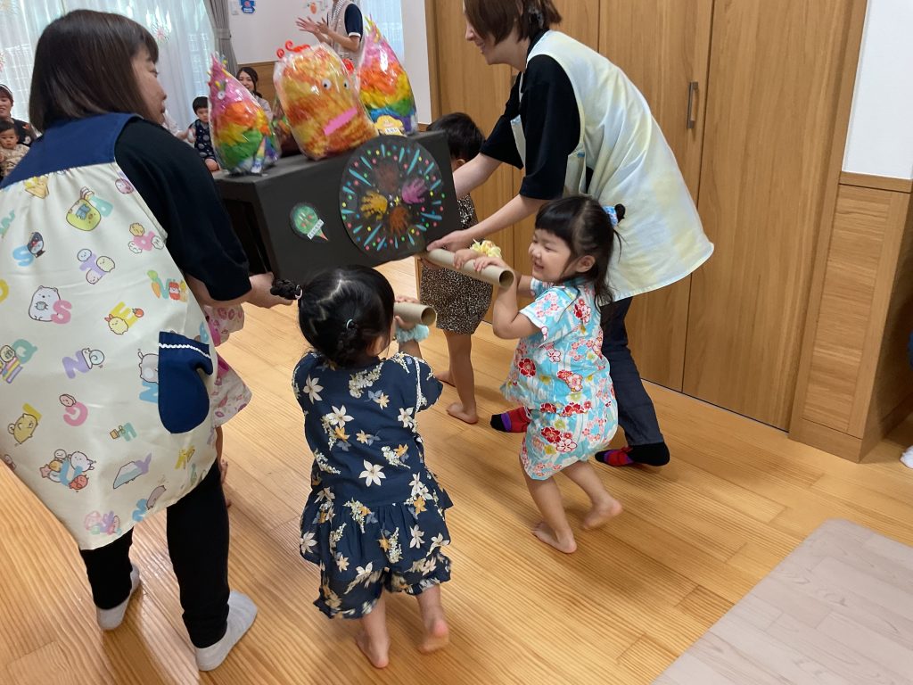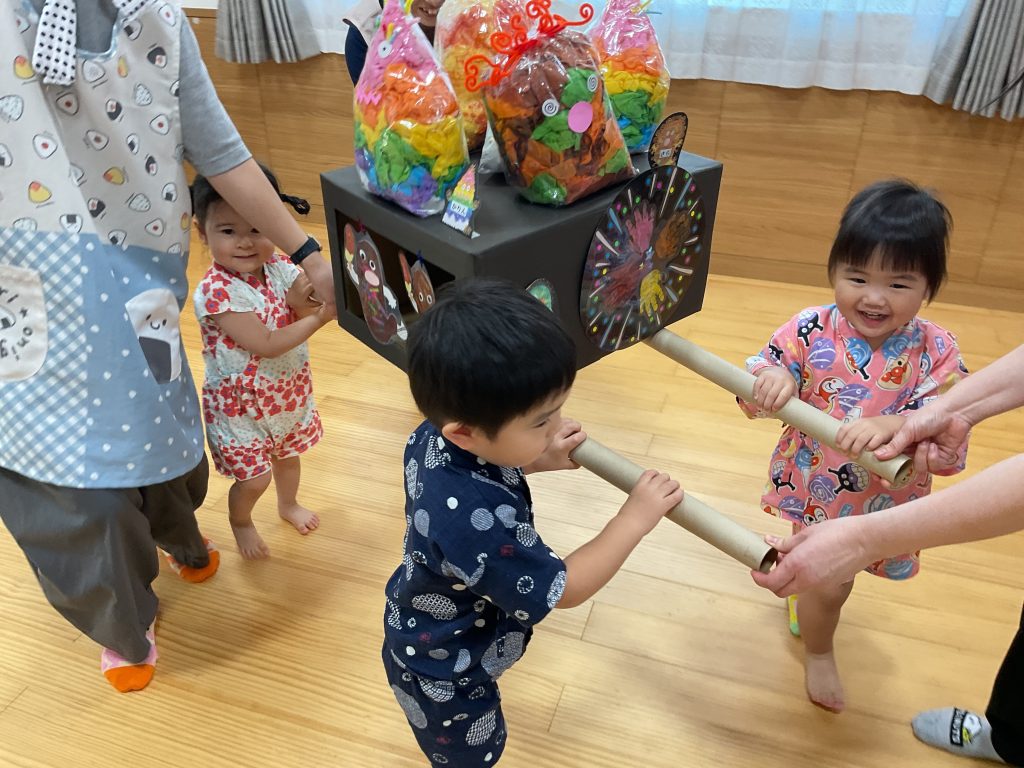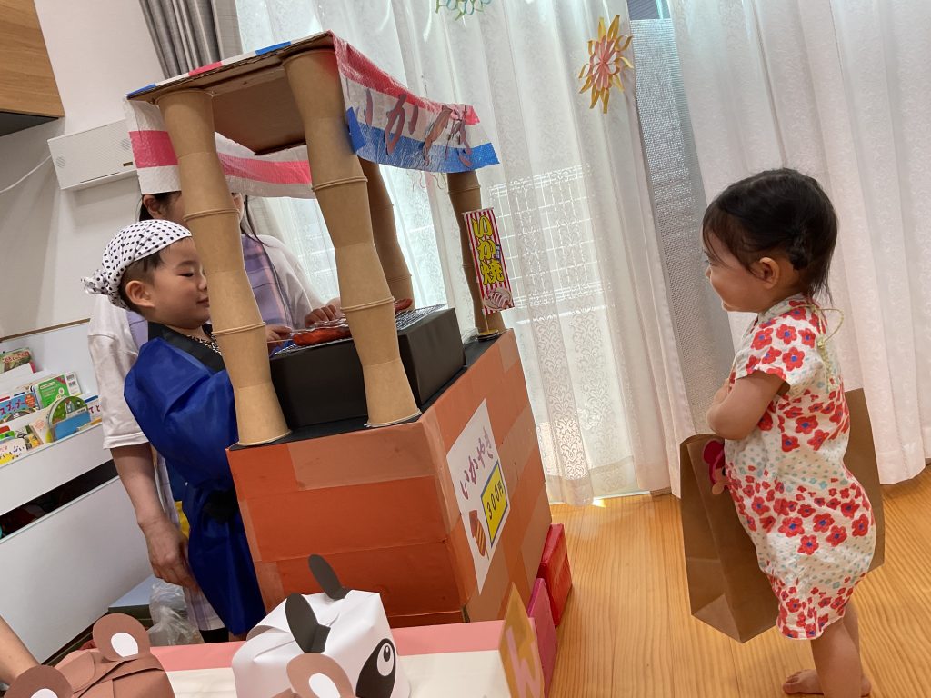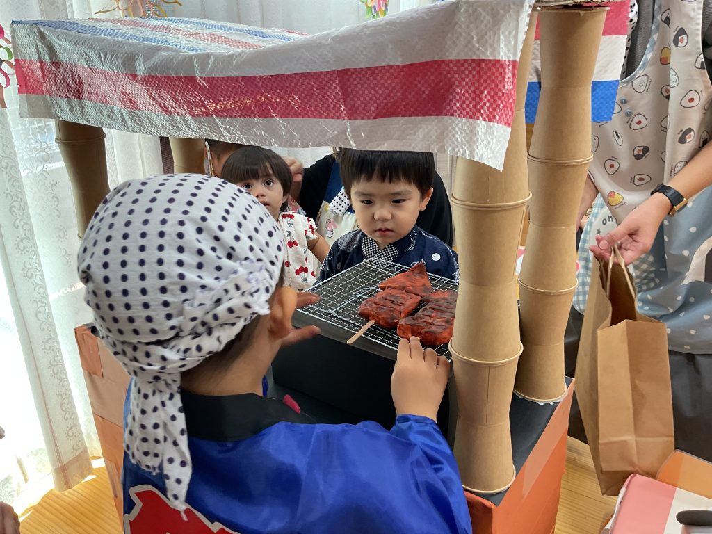 おみこしを担ぎました💛おひさま組も担ぎました🥰🥰にじ組さんのお兄さんお姉さんが屋台の店主です!! クレープ上手にできたねぼうしやさん。いろんな動物の帽子があるね!! 最後はお化け屋敷👻 いろんな仕掛けが👻👻👻 子どもたちも先生も大盛り上がりでした🌟